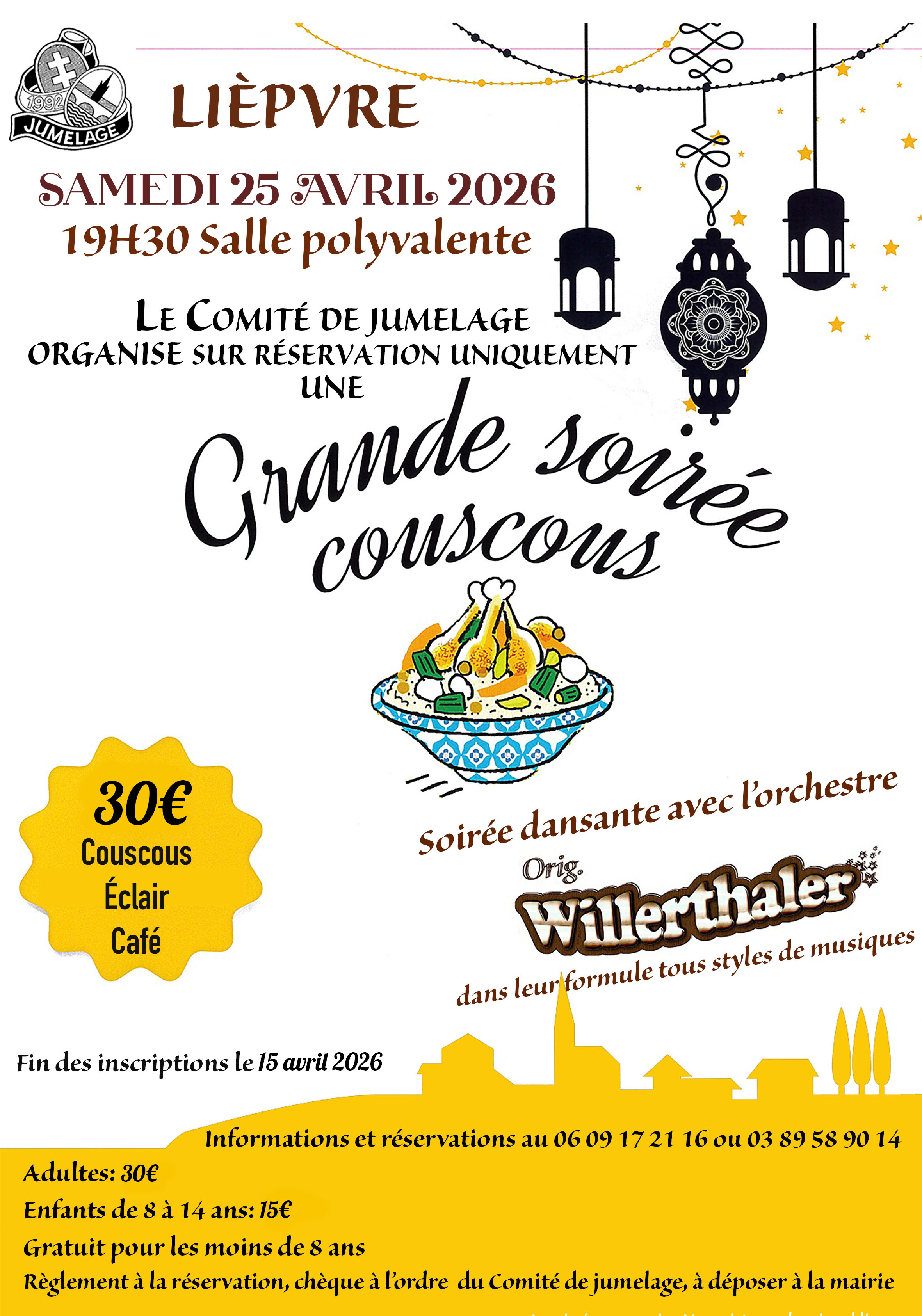 SAM. 25 AVR. : — LIEPVRE — GRANDE SOIREE COUSCOUS — ORGANISEE PAR LE COMITE DE JUMELAGE— SALLE POLYVALENTE — À PARTIR DE 19H30 — RENSEIGNEMENTS ET RESERVATIONS: 06 09 17 21 16 ou 03 89 58 90 14