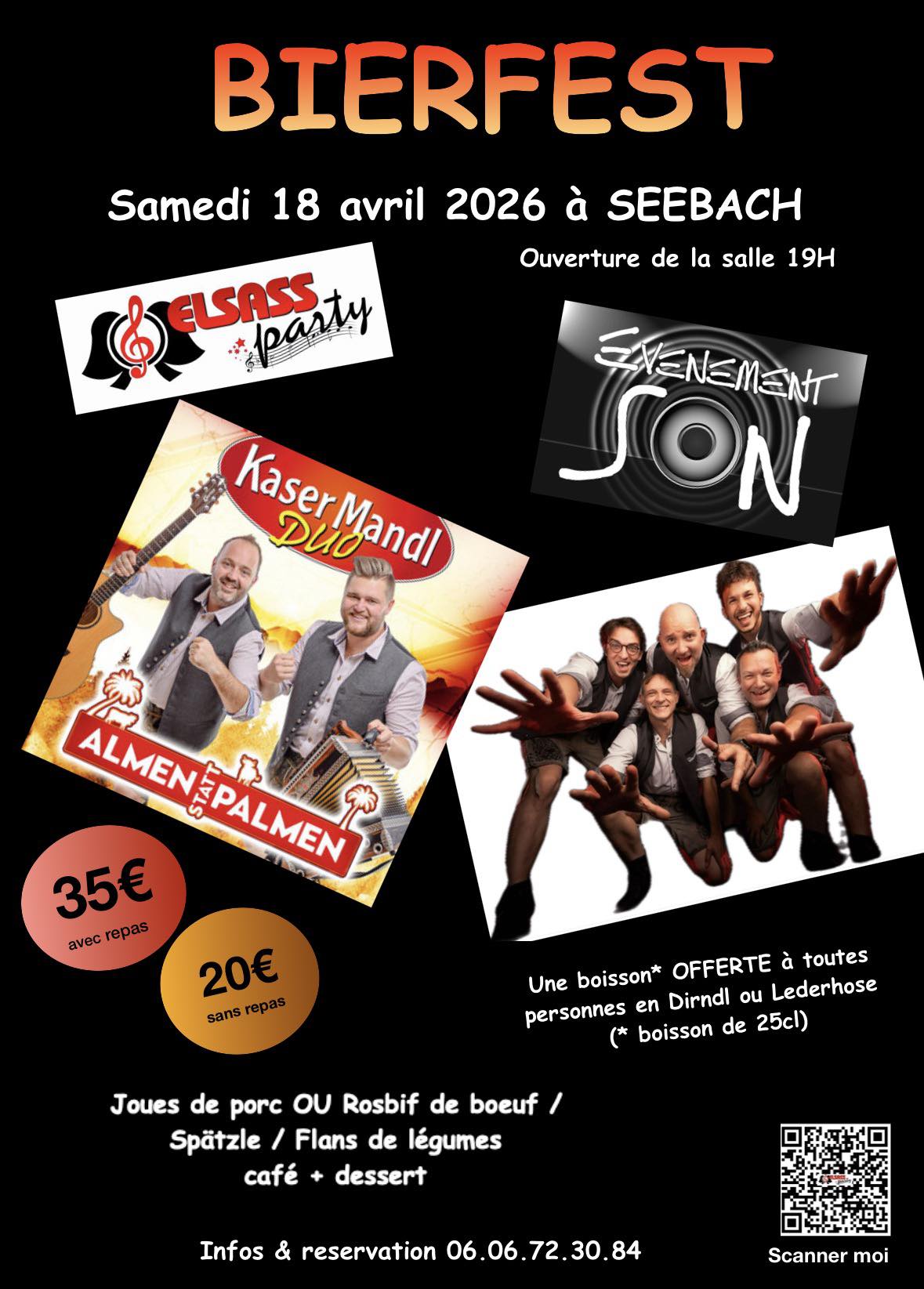 SAM. 18 AVR. : — SEEBACH — BIERFEST — ORGANISEE PAR ELSASS PARTY— SALLE DES FÊTES — OUVERTURE DE LA SALLE À 19H — RENSEIGNEMENTS ET RESERVATIONS: 06 06 72 30 84